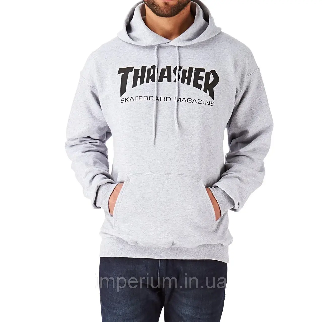 Чоловіче худі з чорним логотипом thrasher skateboard magazine | сіра толстовка